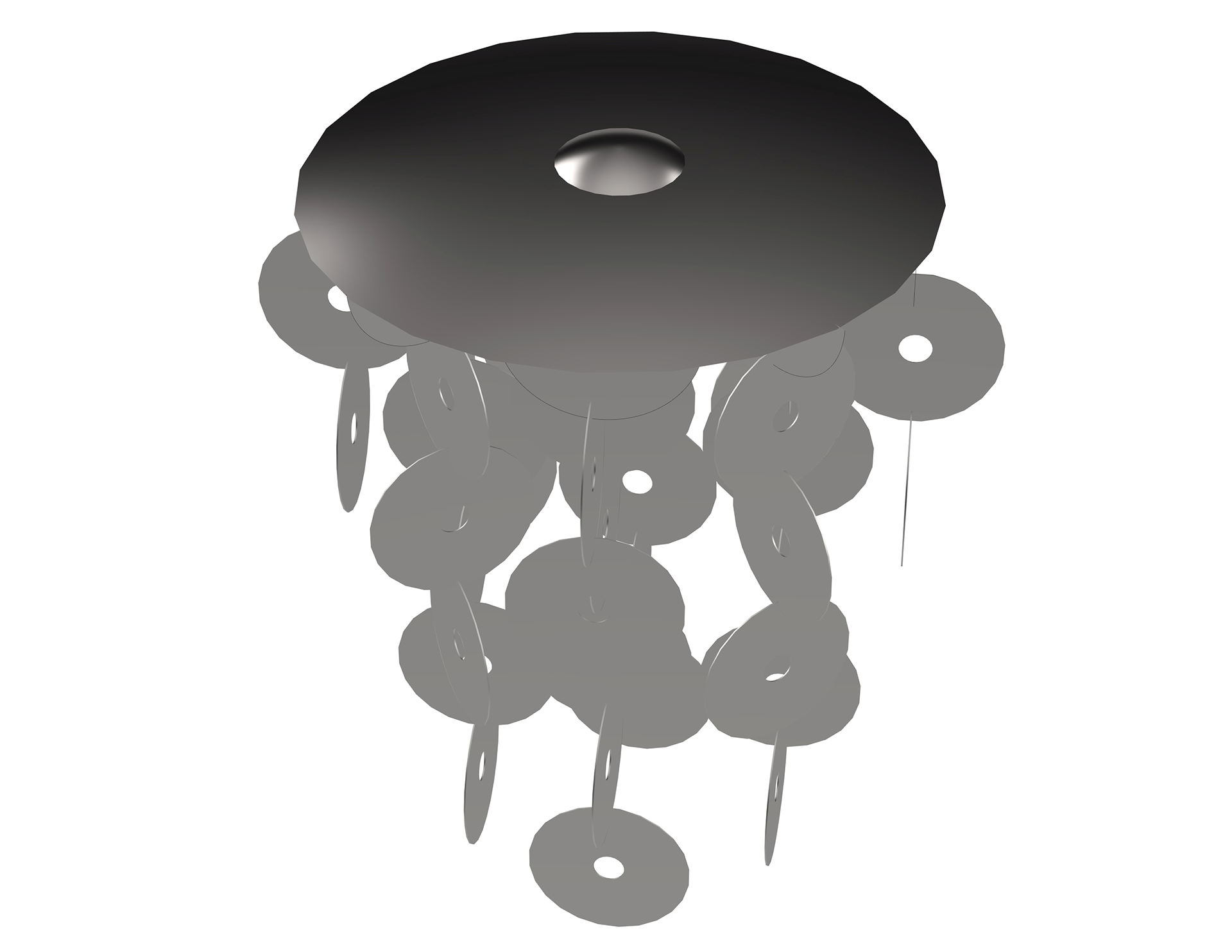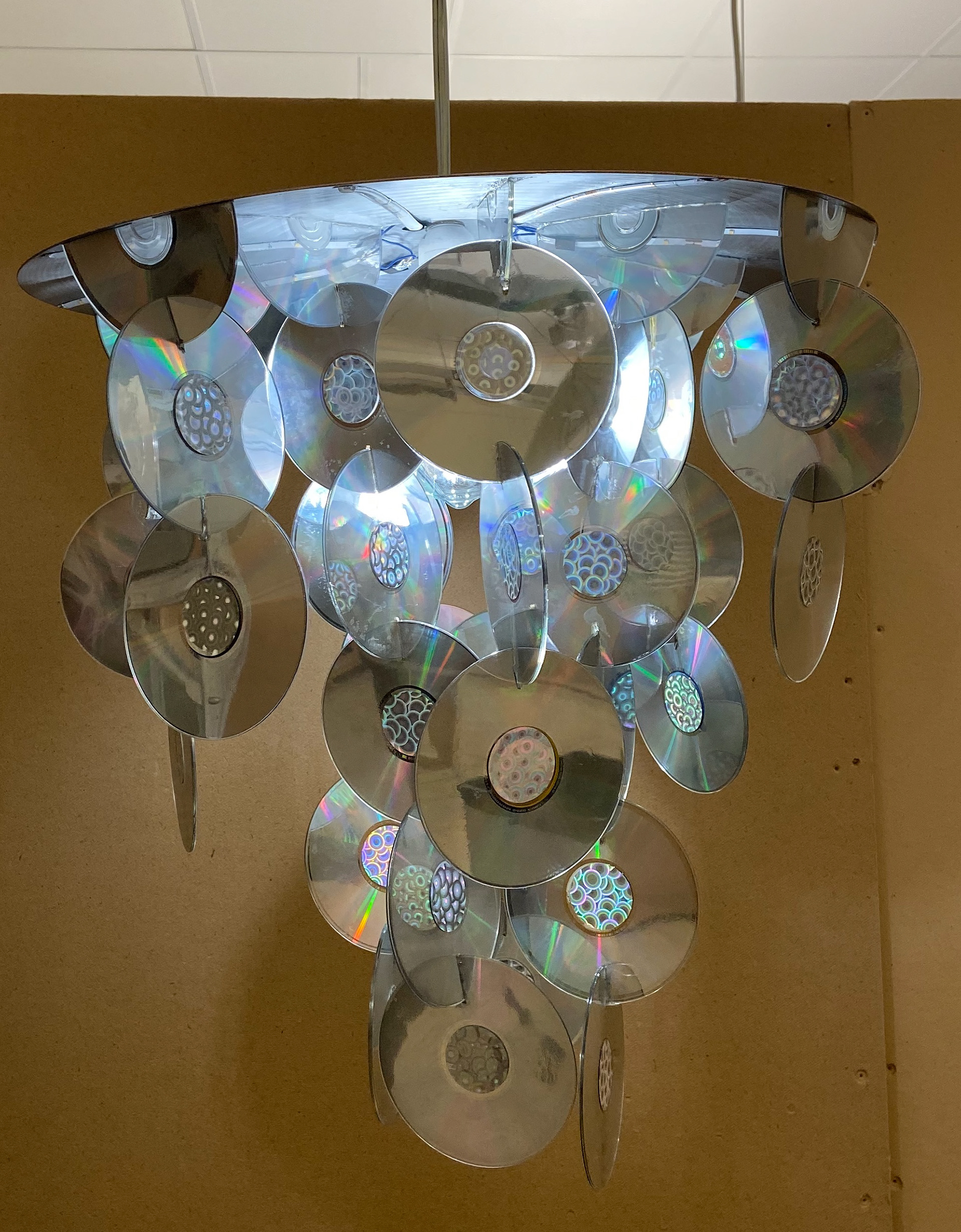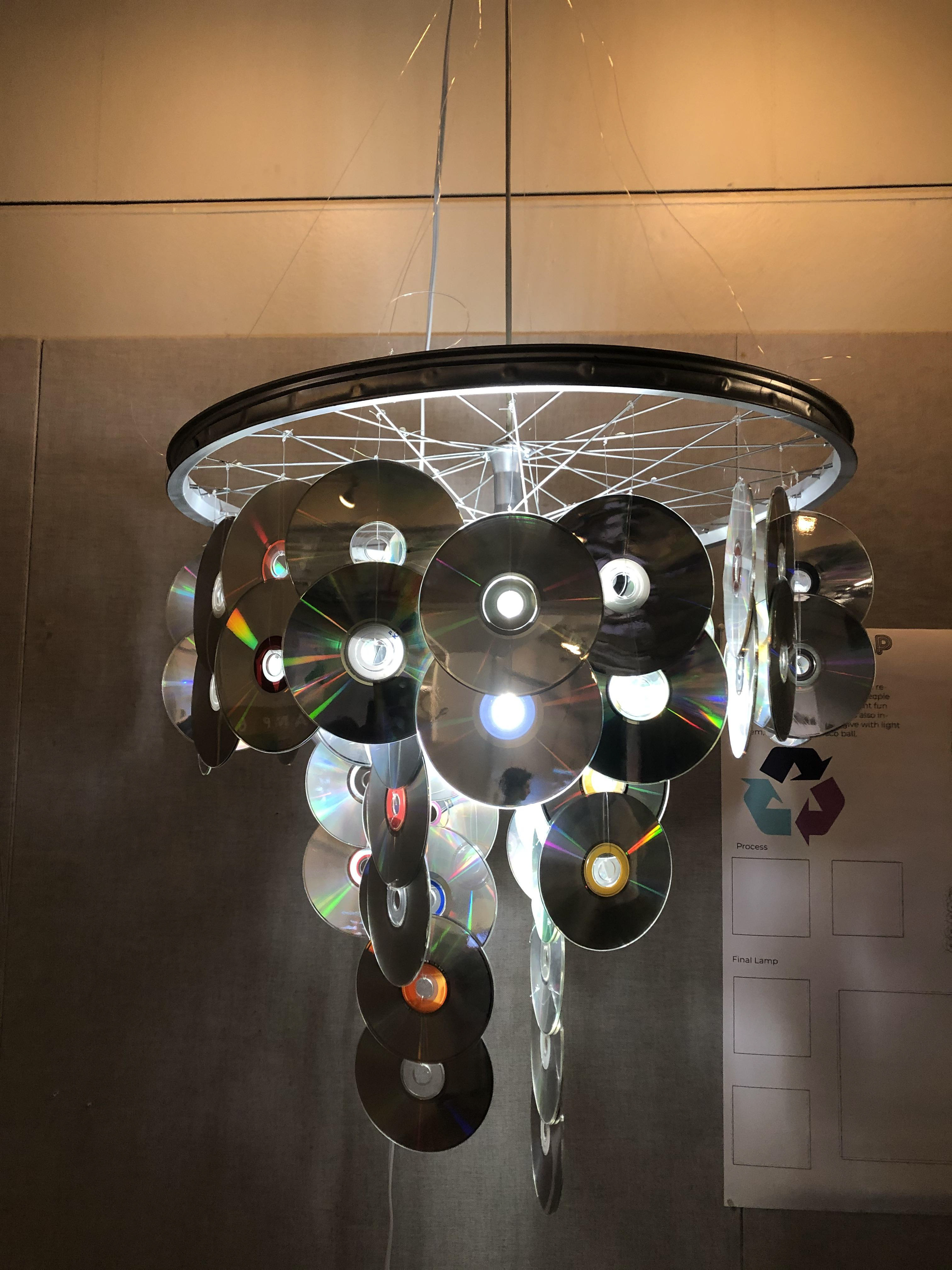 This lamp is up-cycled from old CDs and a drum cymbal. It provides ambient, colorful, and fun lighting.