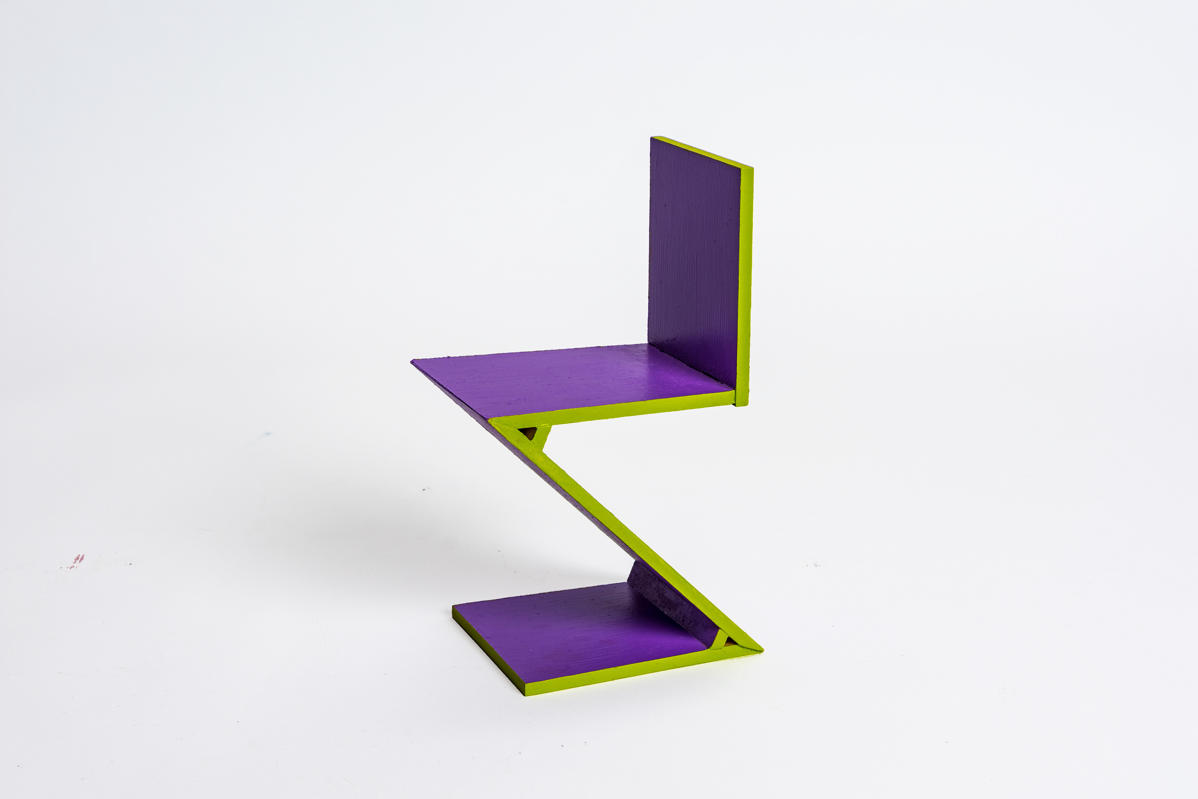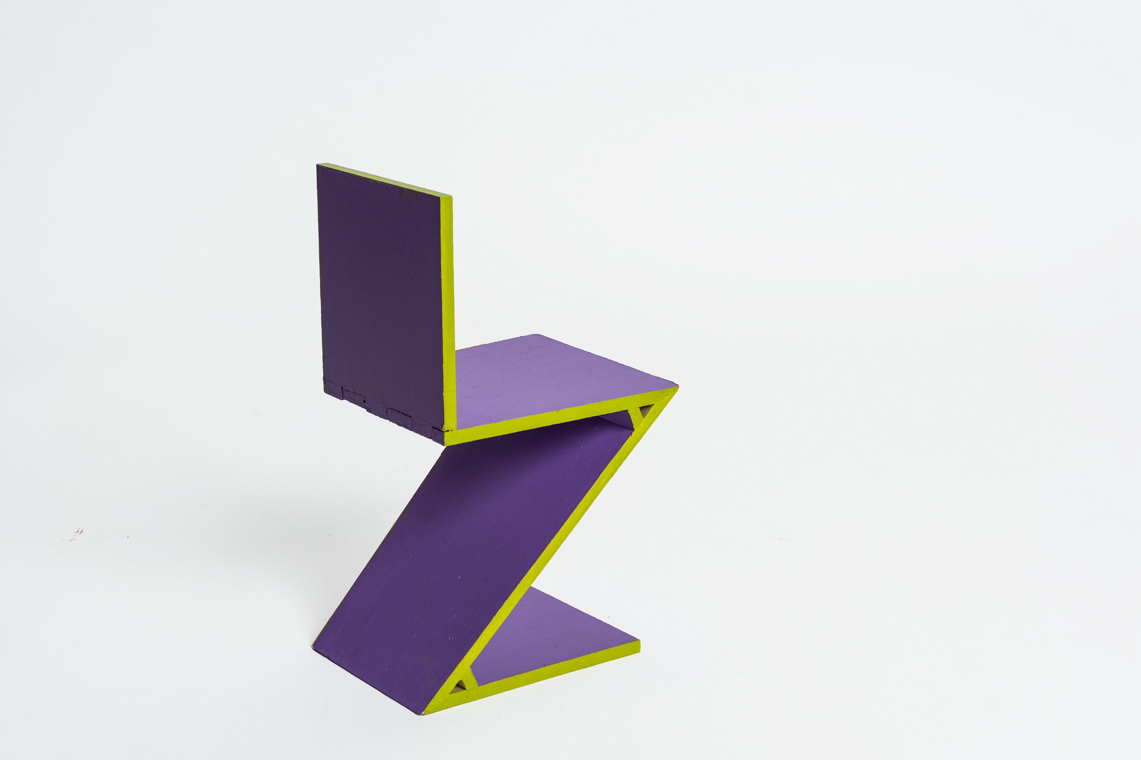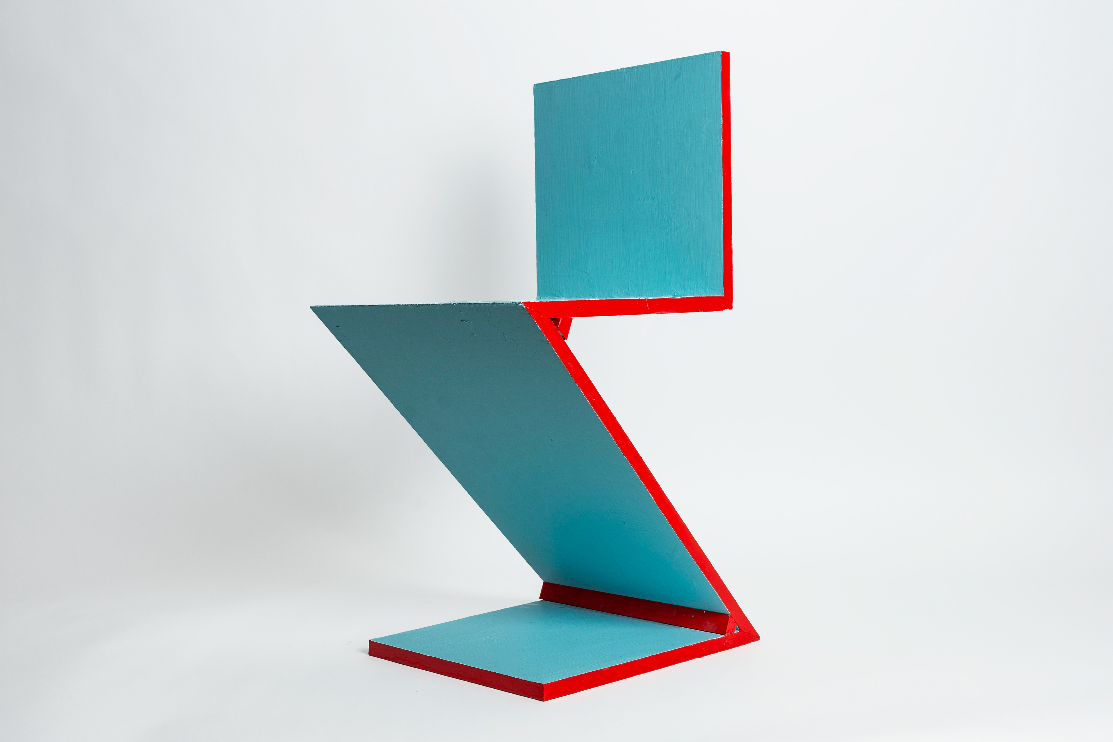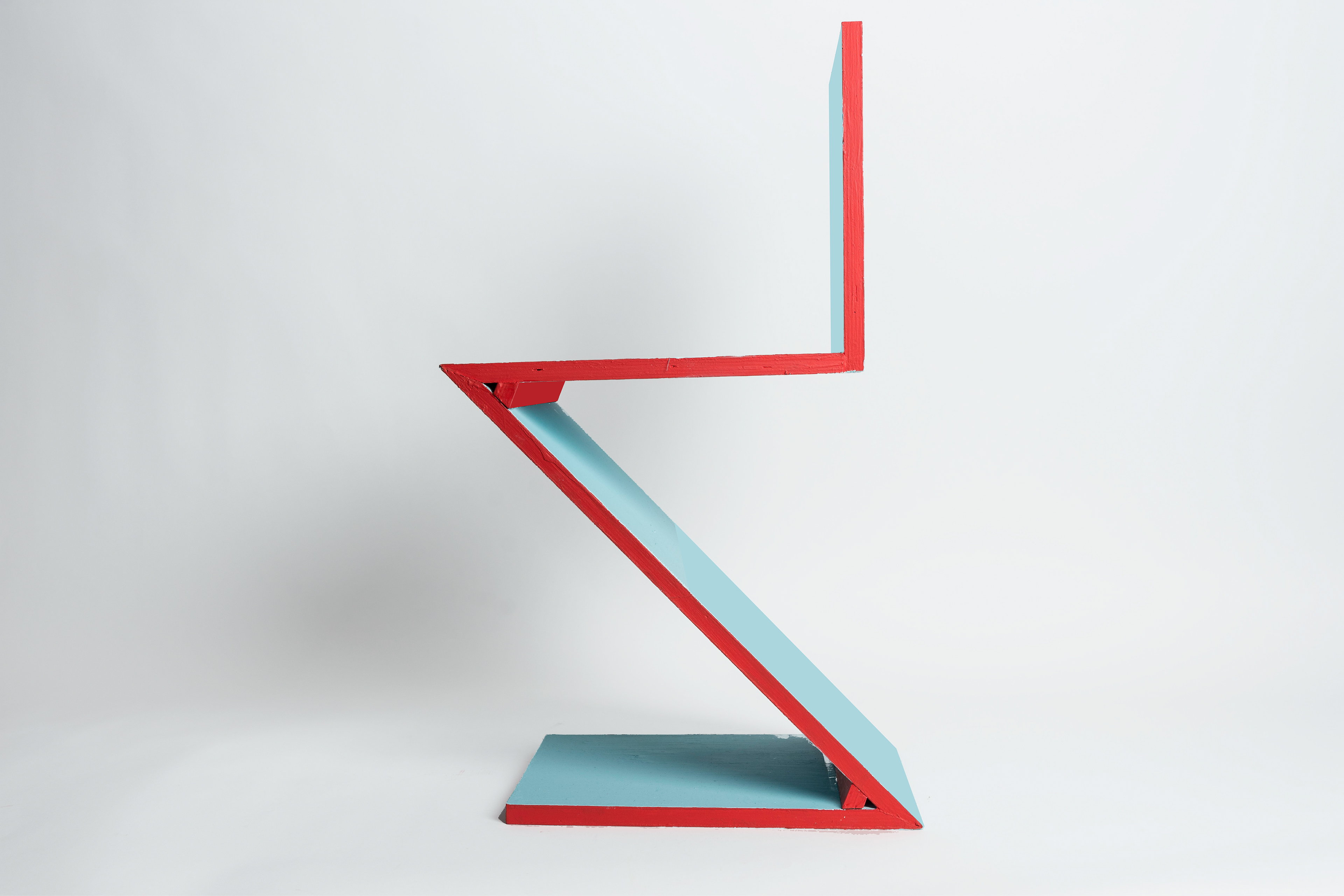 This chair was designed by Gerrit Rietveld. It is hand crafted out of wood and has zero adhesives. The chair can hold human weight from the strong joinery.