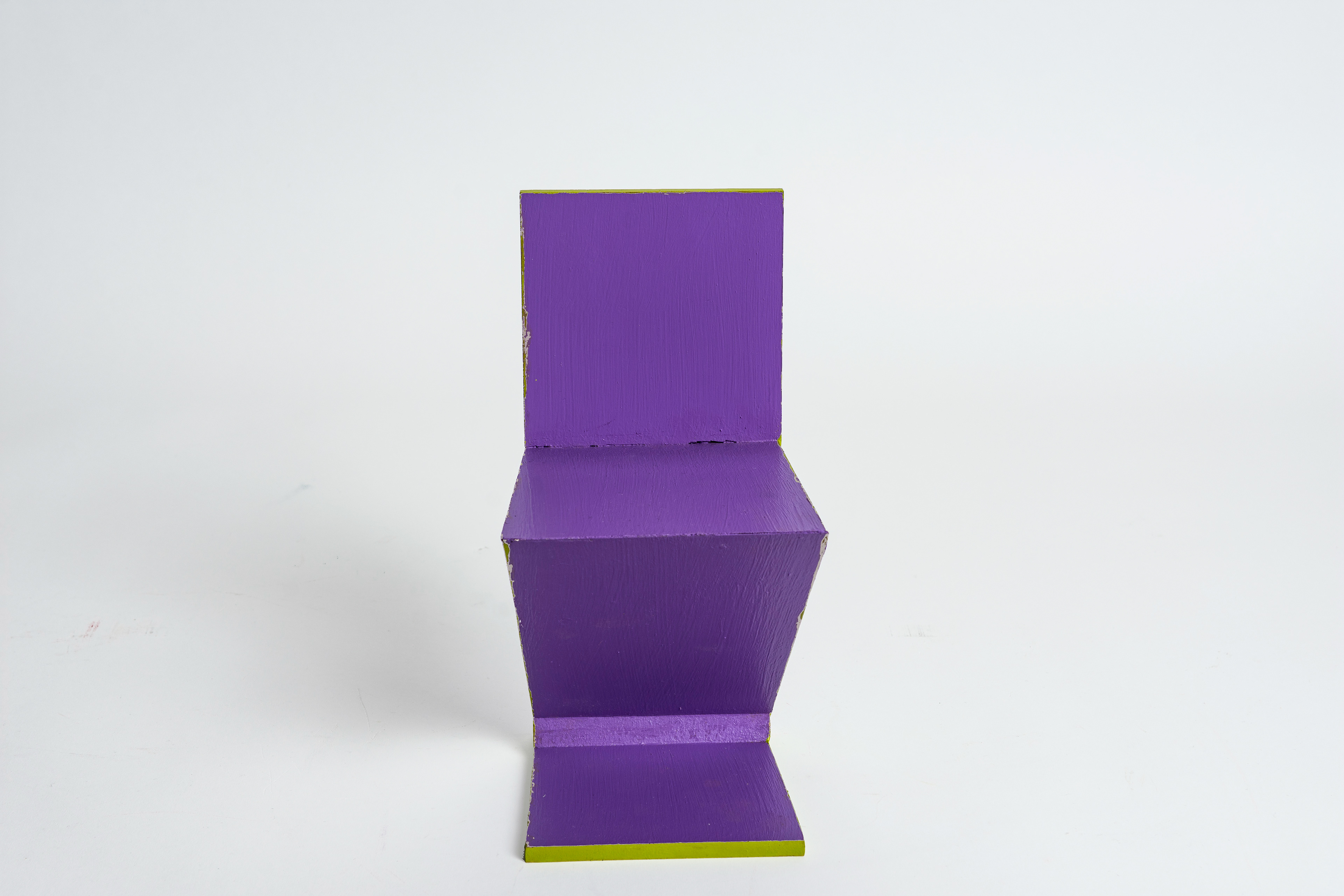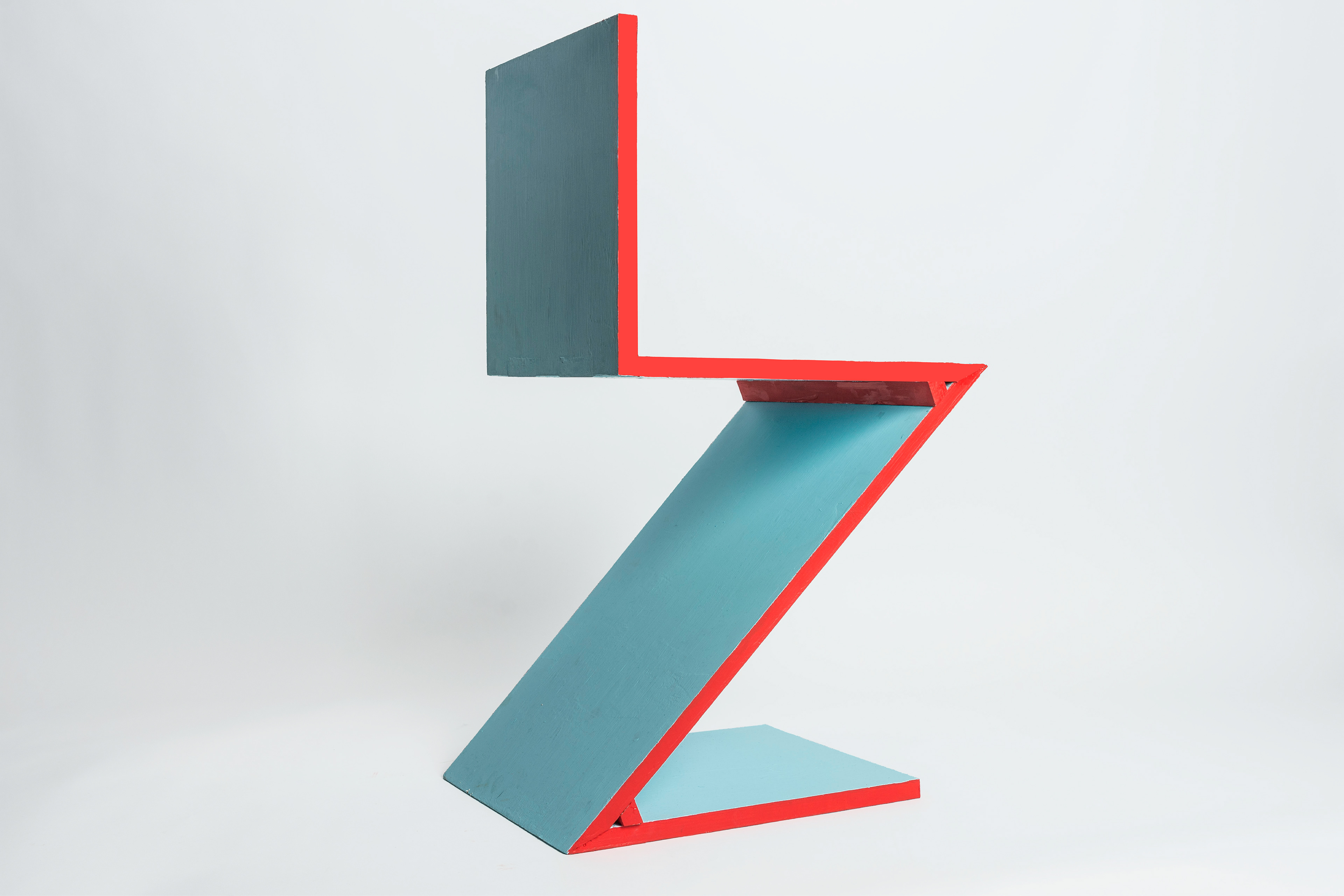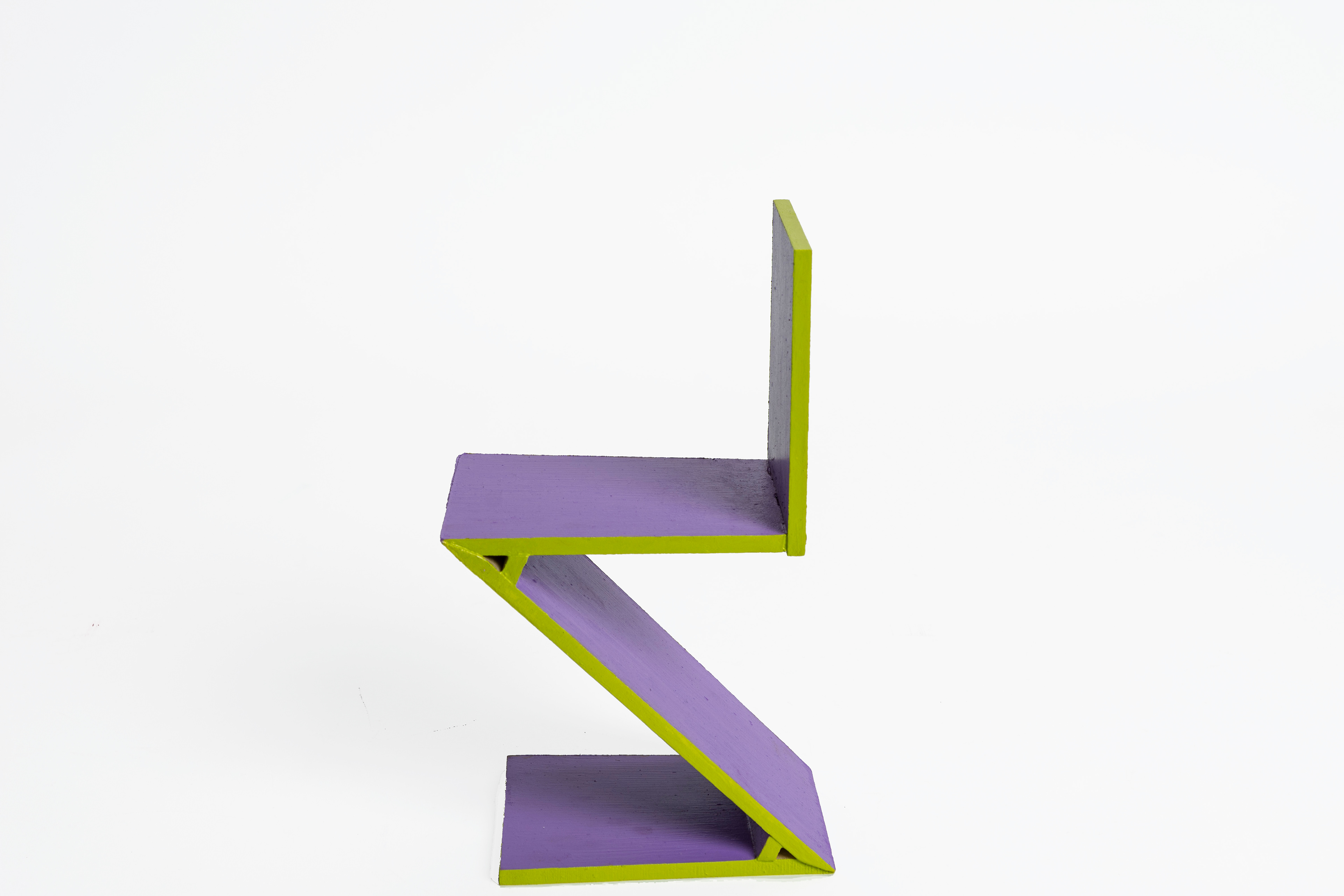 This chair was designed by Gerrit Rietveld. It is hand crafted out of wood and has zero adhesives. The chair can hold human weight from the strong joinery.